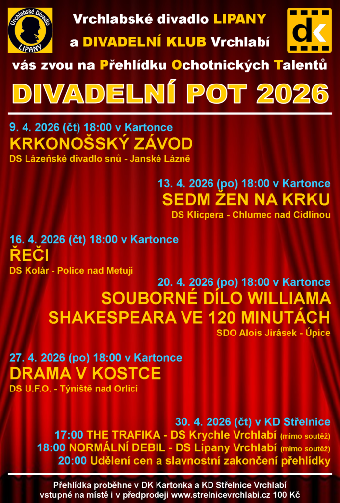 „Vrchlabské Divadlo LIPANY“ založil náš principál s pěti kamarády v r. 2014 za účelem sehrání jednoho představení pro přátele v nedaleké Sokolovně „… ale na představení jim přišli lidi …“ Dnes má Divadlo Lipany 49 aktivních členů, za 10 let nazkoušeli 13 her a zahráli v 57 KD a Sokolovnách 212 představení.